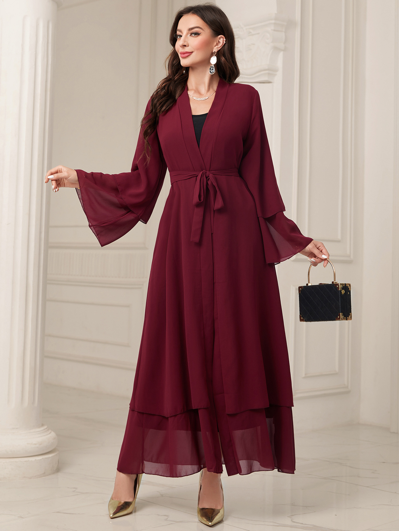 Une ceinture assortie vient souligner la taille, offrant la possibilité de moduler la silhouette selon les préférences. Portée saturée, elle met en valeur les courbes avec subtilité.